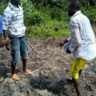The Makelekos boys learn to carefully measure, peg, line and dig some fantastically precise vegetable beds ready for Hope Sakuma's farmer field school where farmers will learn how make beds like this, as well as how to use azolla as a mulch to reduce weeding time and retain moisture in the soil, as rainy season comes to an end.
