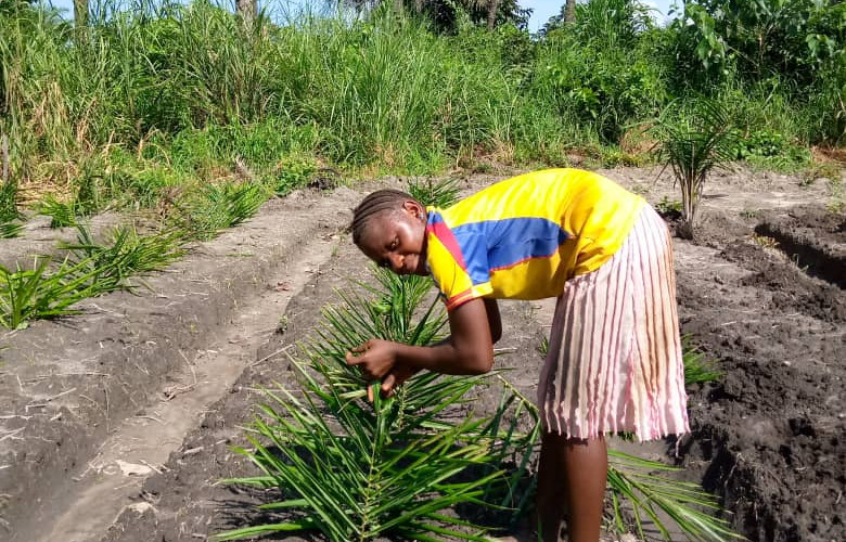 Makelekos All-Stars chief, Mr Mohamed Lamin, shows some of the Makelekos Ladies how to puddle, plant and penumbra with palm in precision produce plots.
