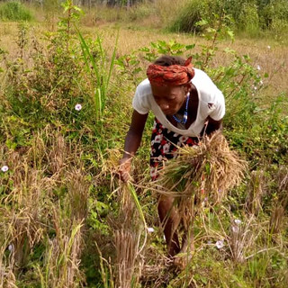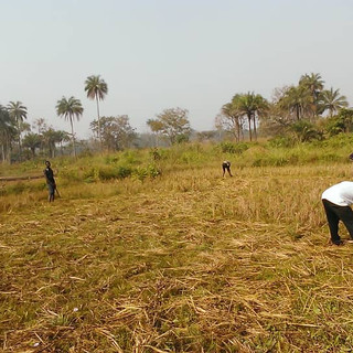 The Makelekos All-Stars harvest the last of the ratooned nerica rice before threshing by foot a total of two bushel, sixteen bushel all told from our Azolla-fertilized paddies.