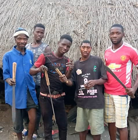 The artisan Kamasorie smithies proudly show off their expertly crafted cutlasses bound for Hope Sakuma's upcoming farmer field school.