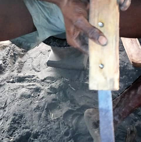 Marvel as our team of five artisan Kamasorie blacksmiths work three furnaces to forge an assorted collection of car parts into cutlasses.